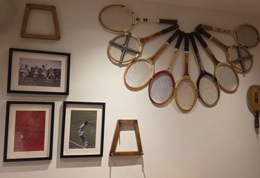 Nuestra decoración combina piezas deportivas vintage —raquetas, pelotas, pósters clásicos y fotografías en blanco y negro— con un estilo cálido y moderno que refleja la esencia del bar.